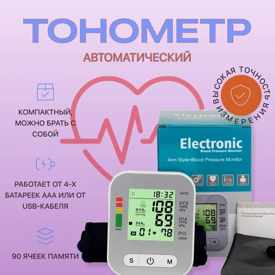 Тонометр электронный автоматический BP-618 для измерения давления, пульса / манжета универсального размера 22-32см / Цвет: Белый интересное: