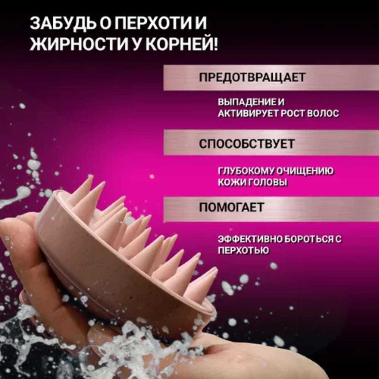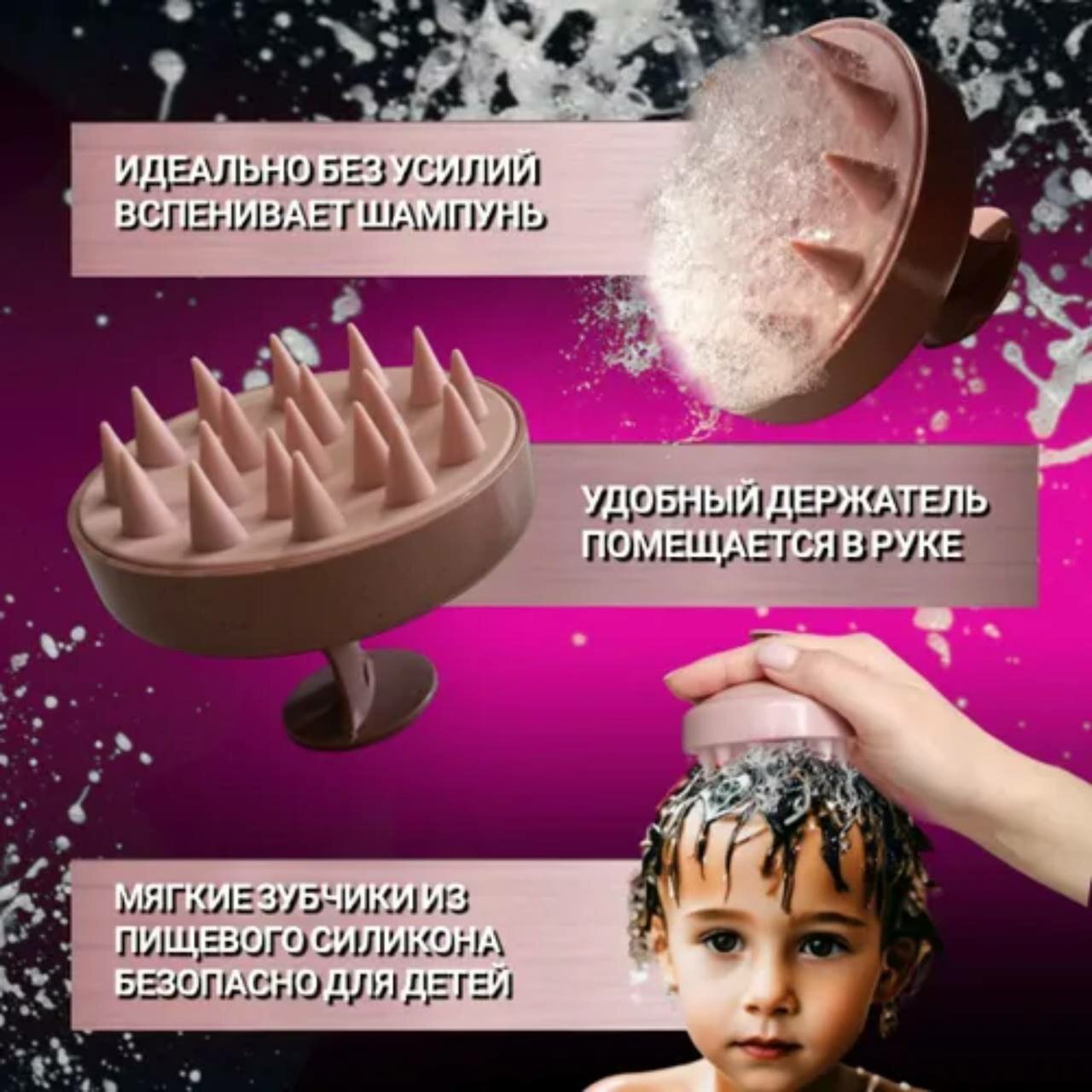 Массажная щетка для мытья волос и кожи головы силиконовая розовая