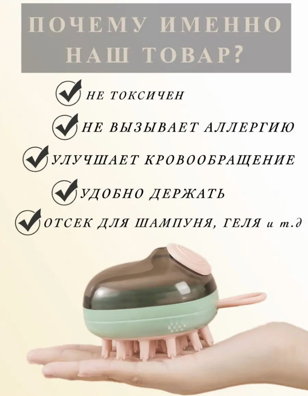Массажер для головы "Отсек под шампунь" интересное: