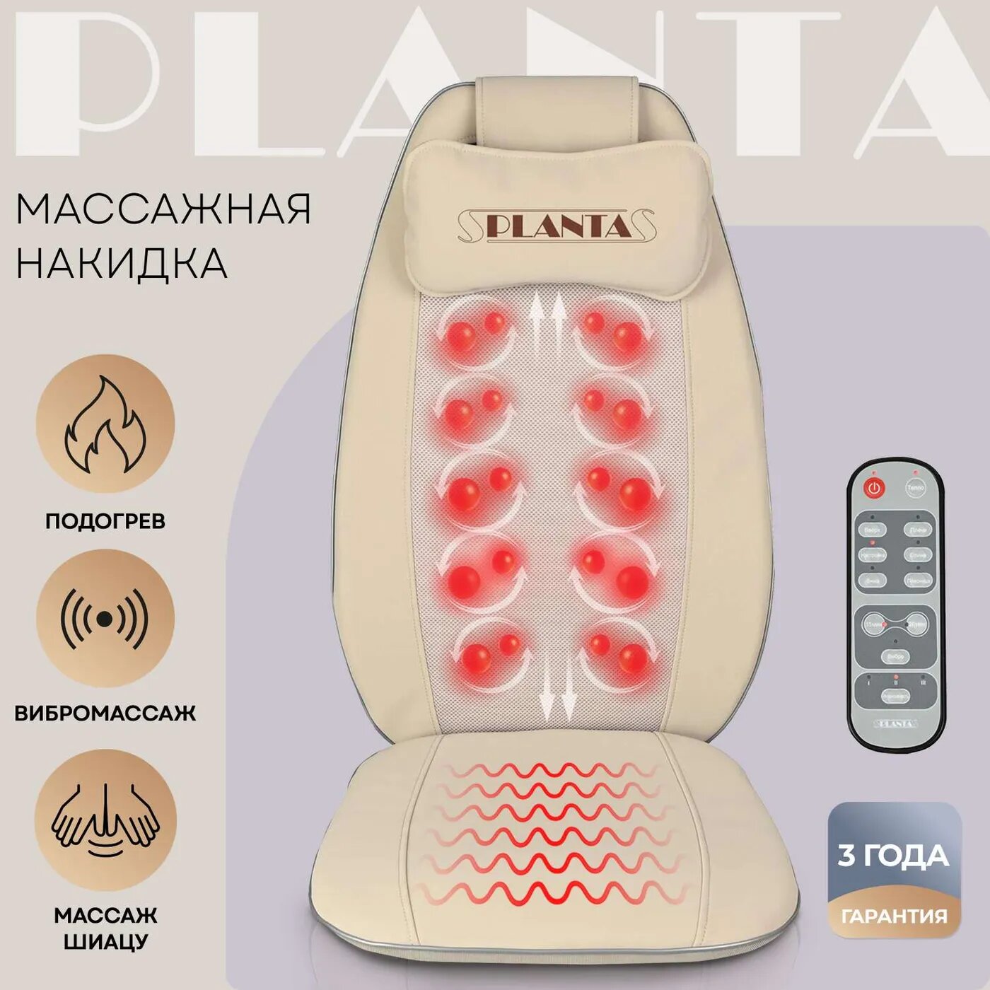 Массажная накидка шиацу PLANTA MN-600, 3 уровня интенсивности, подогрев, вибромассаж, автоадаптер, массажер на кресло и сиденье