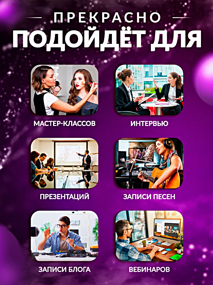 | Назначение | для интервью / для компьютера / для конференций / для подкастов/радио/телевидения / для смартфона/планшета / для стриминга / универсальный |
