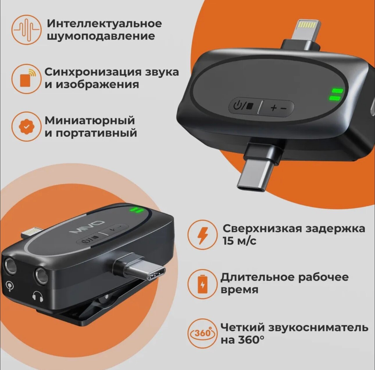 Микрофон петличный беспроводной для телефона Type-C и Lightning Mivo MK-630