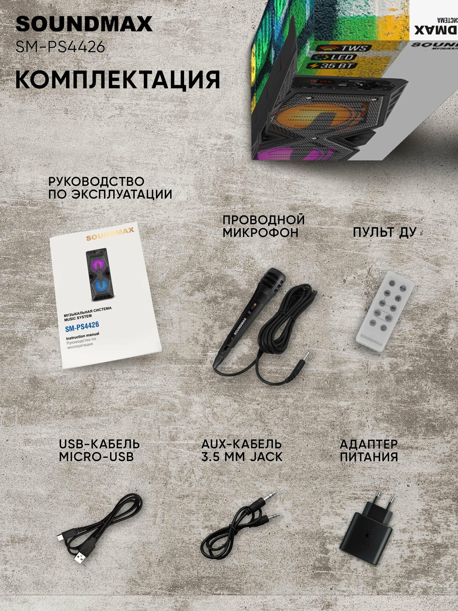 | Подробная комплектация | Музыкальный центр, микрофон, адаптер питания, USB-кабель, AUX-кабель |