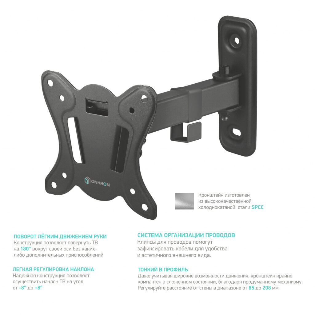 Кронштейн ONKRON/ 17-27"" макс 100*100 мм, 1 колено, наклон -+ 8?, поворот: 180°, от стены 65-208 мм, макс вес 25кг, черный