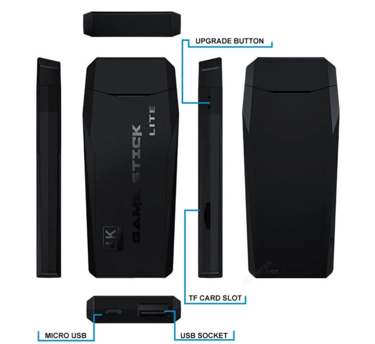 | Подробная комплектация | 2 черные игровые приставки, консоль (черная, с 2 разъемами), USB-кабель черный размер 29.5 см (адаптер не входит в комплект), HDMI-кабель черный с пластиковой крышечкой на одном конце размер 22 см ( WI-FI адаптер входит в комплект), TF card в комплект входит (вставлена в консоль сбоку), фирменная упаковка, инструкция на английском языке |