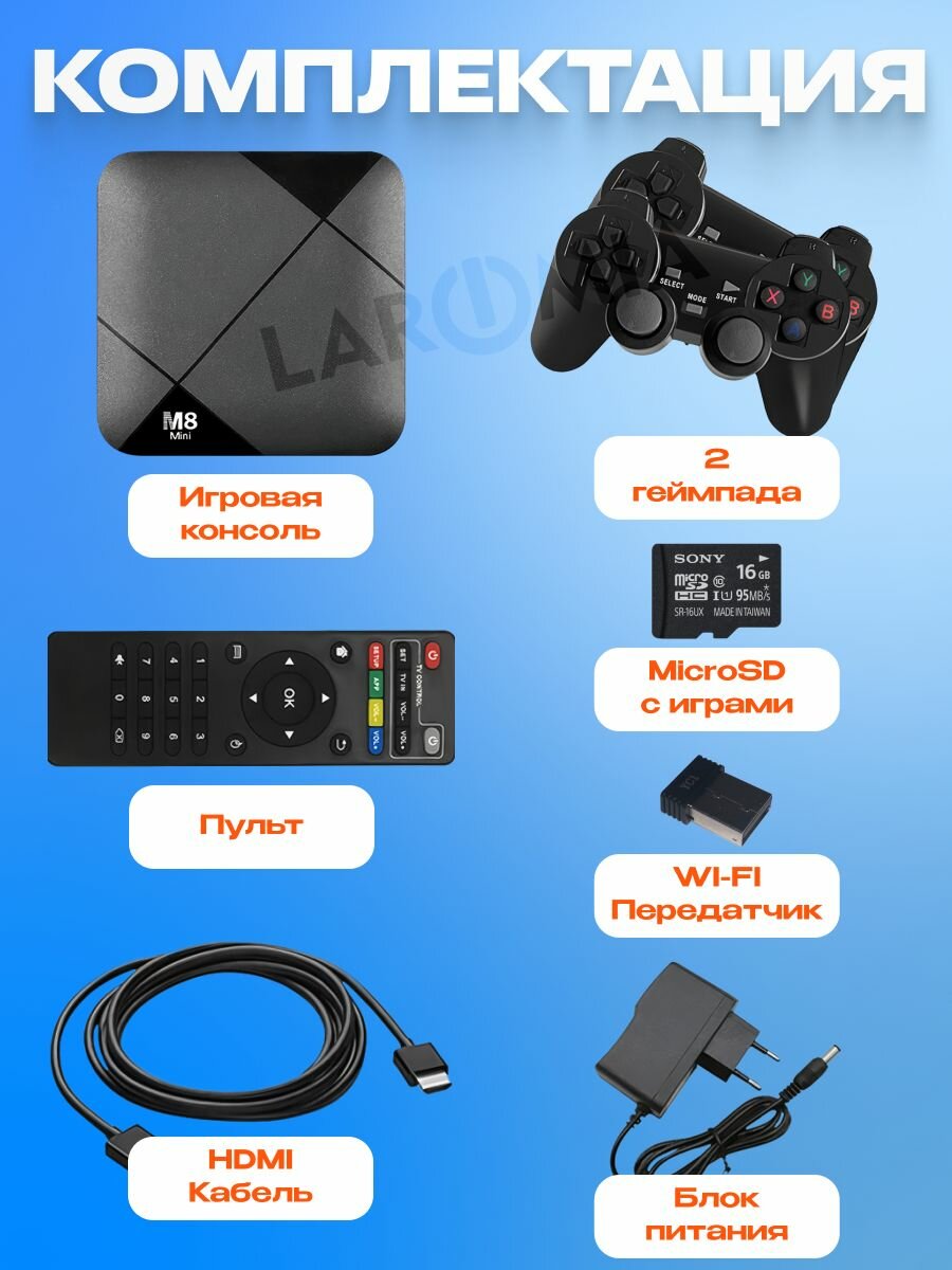 | Подробная комплектация | игровая консоль, кабель HDMI, 2 геймпада, передатчик WI-FI, блок питания, пульт, MicroSD с играми. |
