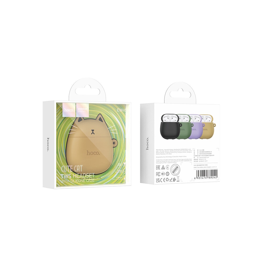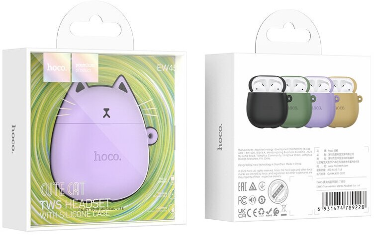 | Дополнительная информация | Стильные и яркие беспроводные наушники EW45 поддерживают беспроводную свять с помощью технологии Bluetooth версии 5.3. В комплект входит силиконовый чехол с ушками и брелком, выполненный в ярком и интересном дизайне. Время автономной работы наушников в режиме ожидания составляет до 200 часов, а в режиме использования - 4 часа. Наушники Hoco идеально подходят для занятий спортом, прогулок или отдыха. Выполнены в 4-х цветах. |