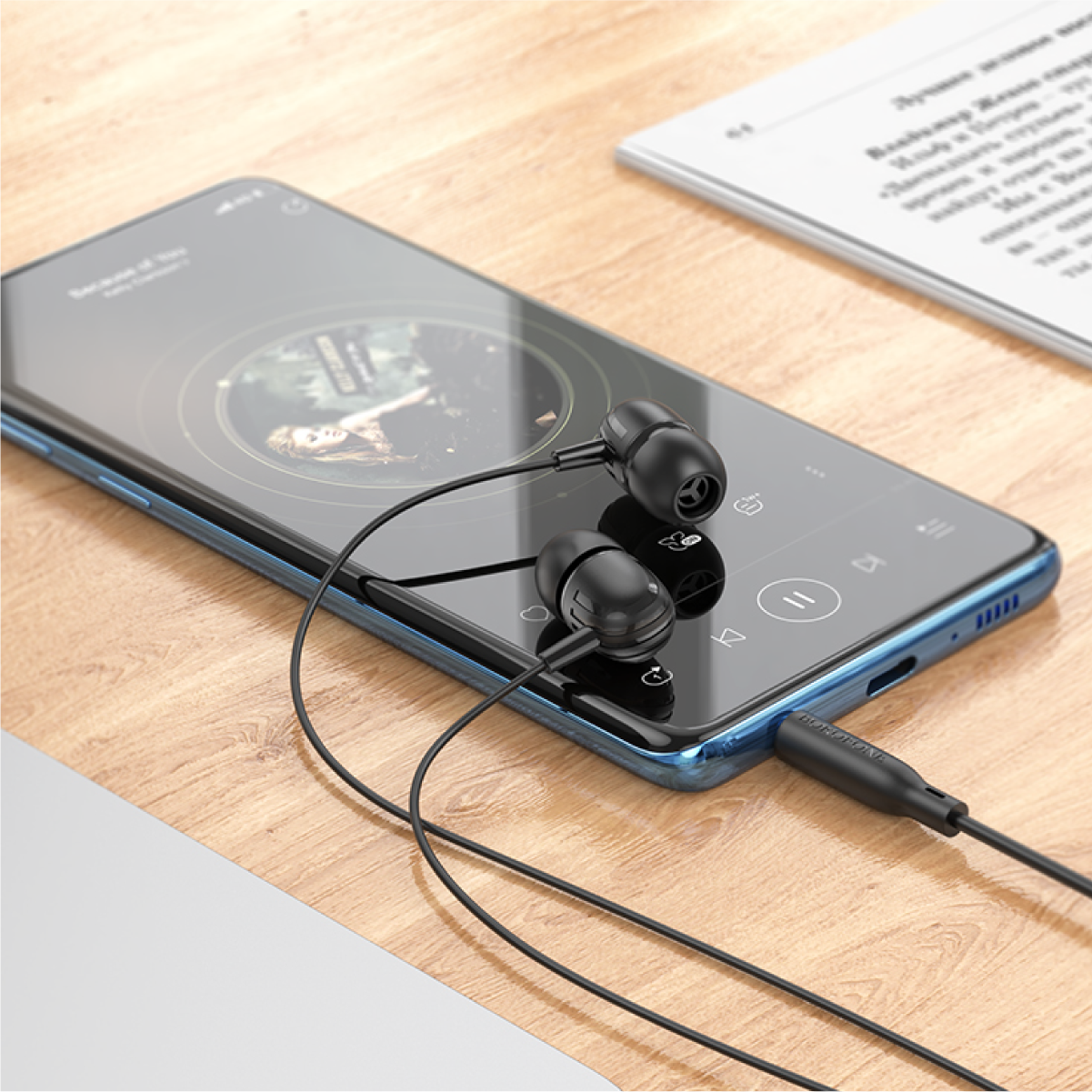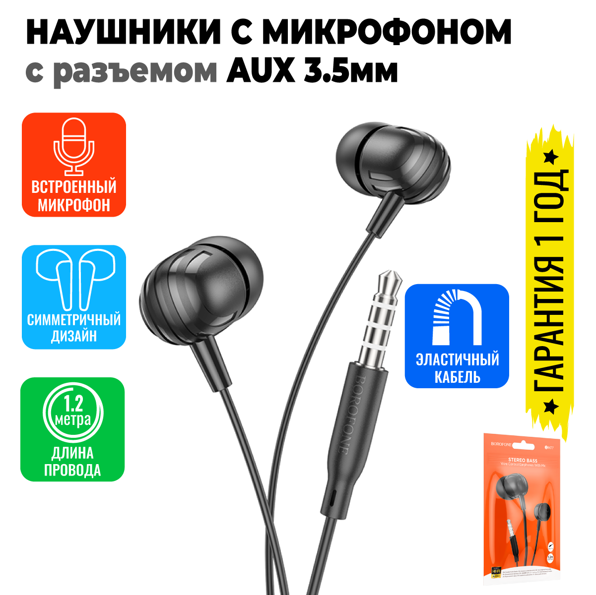 Наушники внутриканальные Borofone BM77 Ascending, пластик, микрофон, кнопка ответа, 1.2 м, чёрные