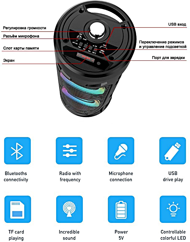| Особенности | FM-радио / караоке / ручка / световые эффекты |
