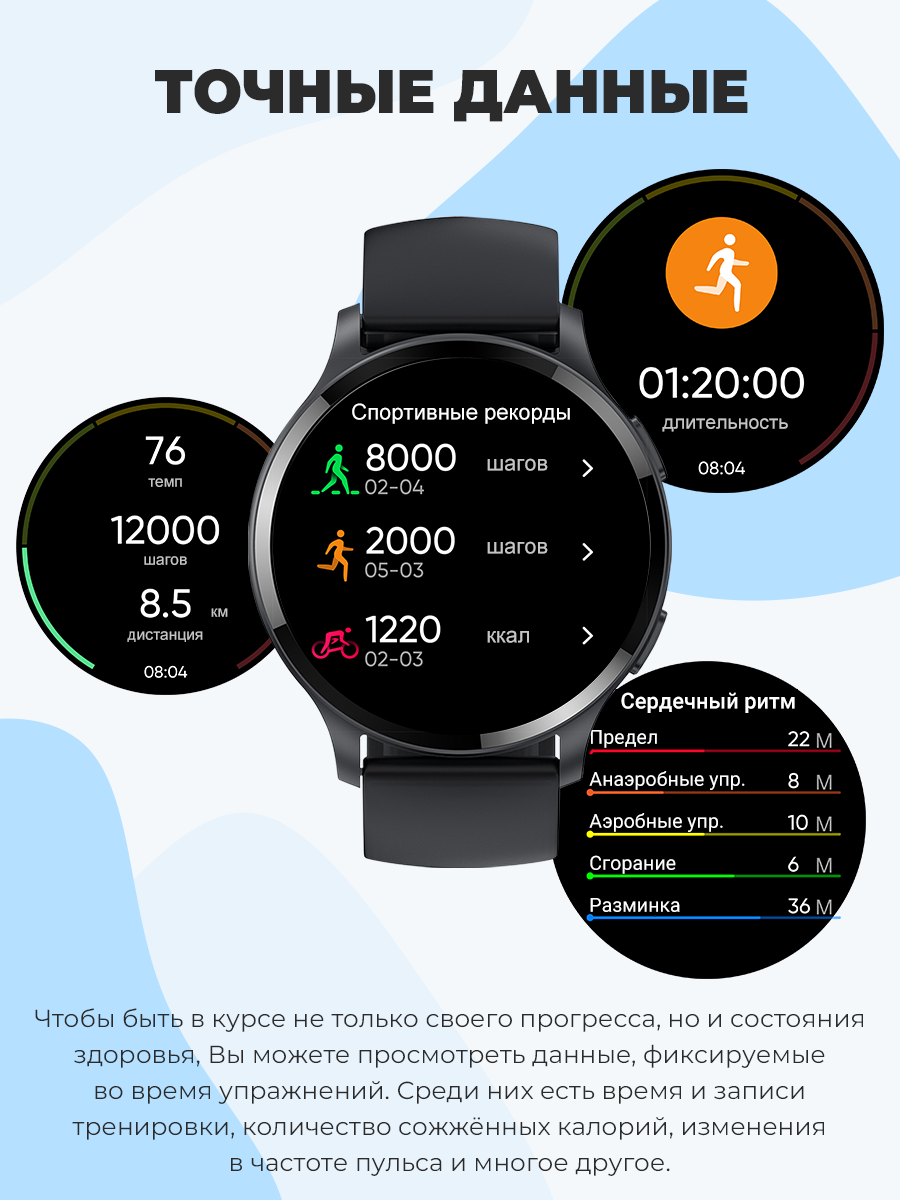 | Дополнительные функции | будильник / вибрация / гироскоп / динамик / дыхательная гимнастика / микрофон / секундомер / таймер / шагомер |