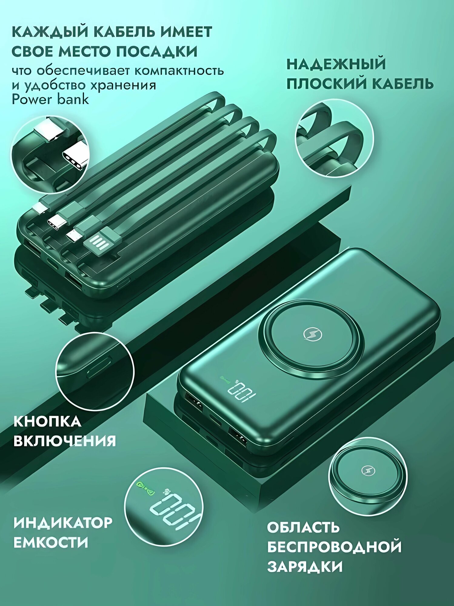 СохранитьВнешний аккумулятор с беспроводной зарядкой на 20000 мАч, зелёный, повербанк для смартфонов, портативная зарядка, Micro USB, lightning, USB-A, Type-C интересное: