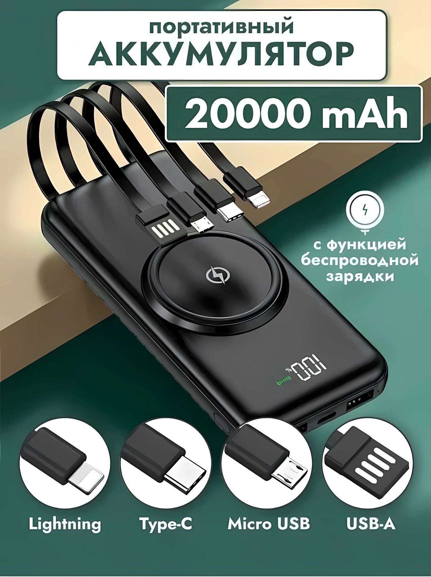 Внешний аккумулятор с беспроводной зарядкой на 20000 мАч, чёрный, повербанк для смартфонов, портативная зарядка, Micro USB, lightning, USB-A, Type-C