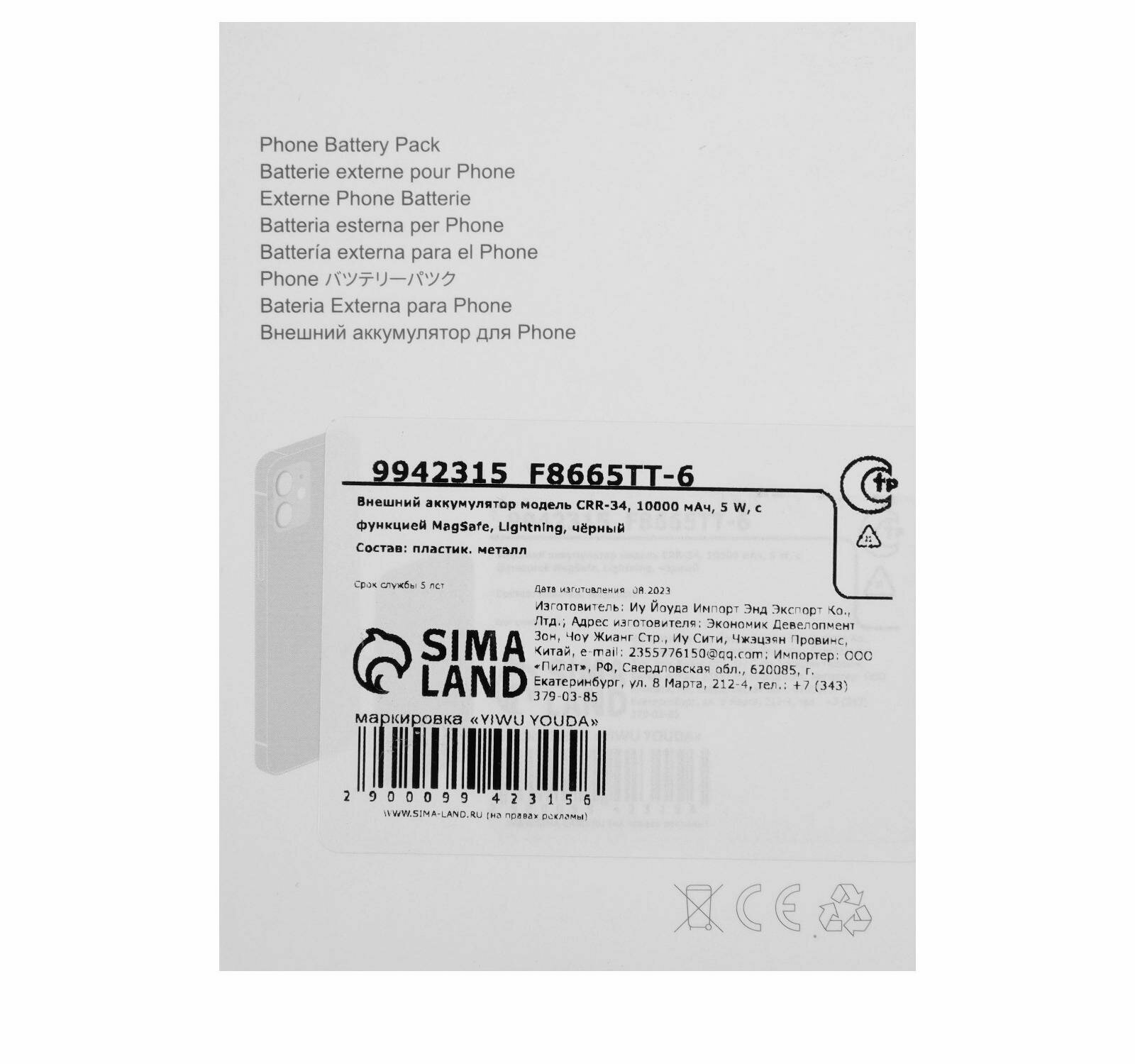 Внешний аккумулятор CRR-34, 10000 мАч, 5 W, для Iphone с функцией MagSafe, чёрный