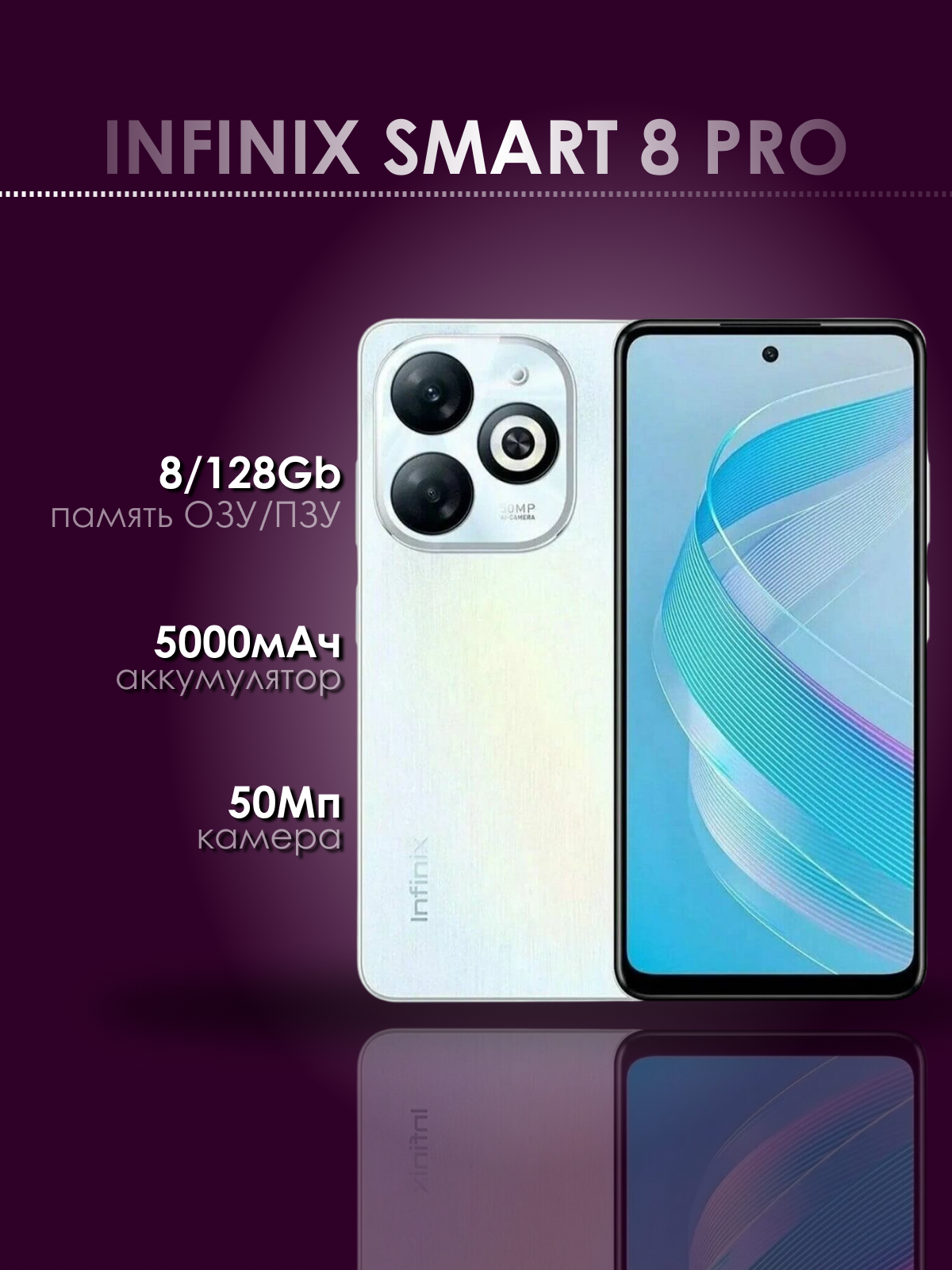 Купить Смартфон Infinix X6525B Smart 8 Pro 128Gb 8Gb белый моноблок 3G 4G 2Sim 6.56 720x1612 Android 50Mpix 802.11 a/b/g/n/ac GPS GSM900/1800 GSM1900 TouchSc