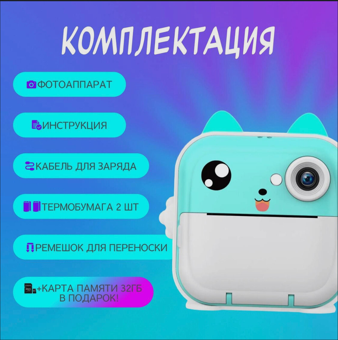 | Комплектация | Фотоаппарат- 1 шт; термобумага - 2 рулона; USB шнур - 1шт; карта памяти - 1 шт; подарок - 1 шт, инструкция - 1 шт. |