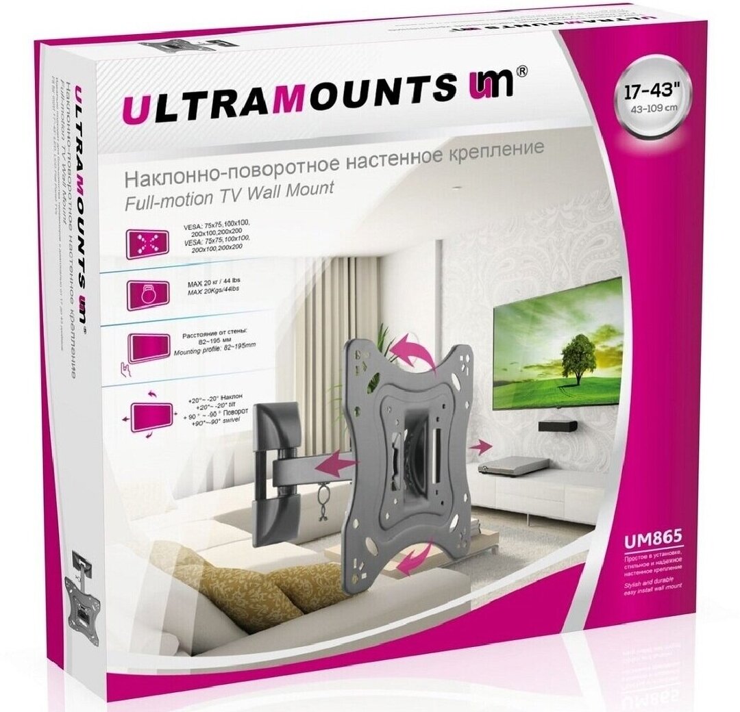 Ultramounts Кронштейн Ultramounts UM865, для ТВ, наклонно-поворотный, 17-43, 82-195 мм от стены, черный
