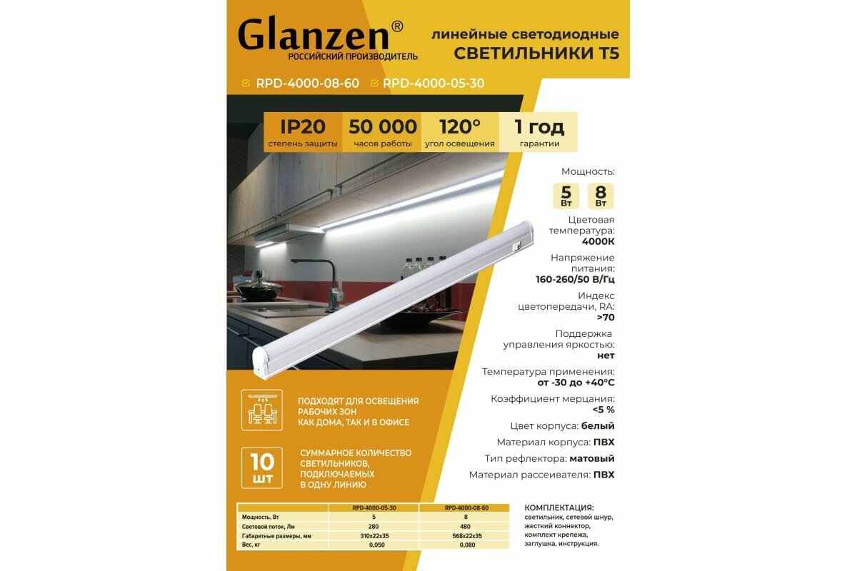 Светодиодный линейный светильник T5 GLANZEN 8Вт RPD-4000-08-60 IP20 4000K интересное: