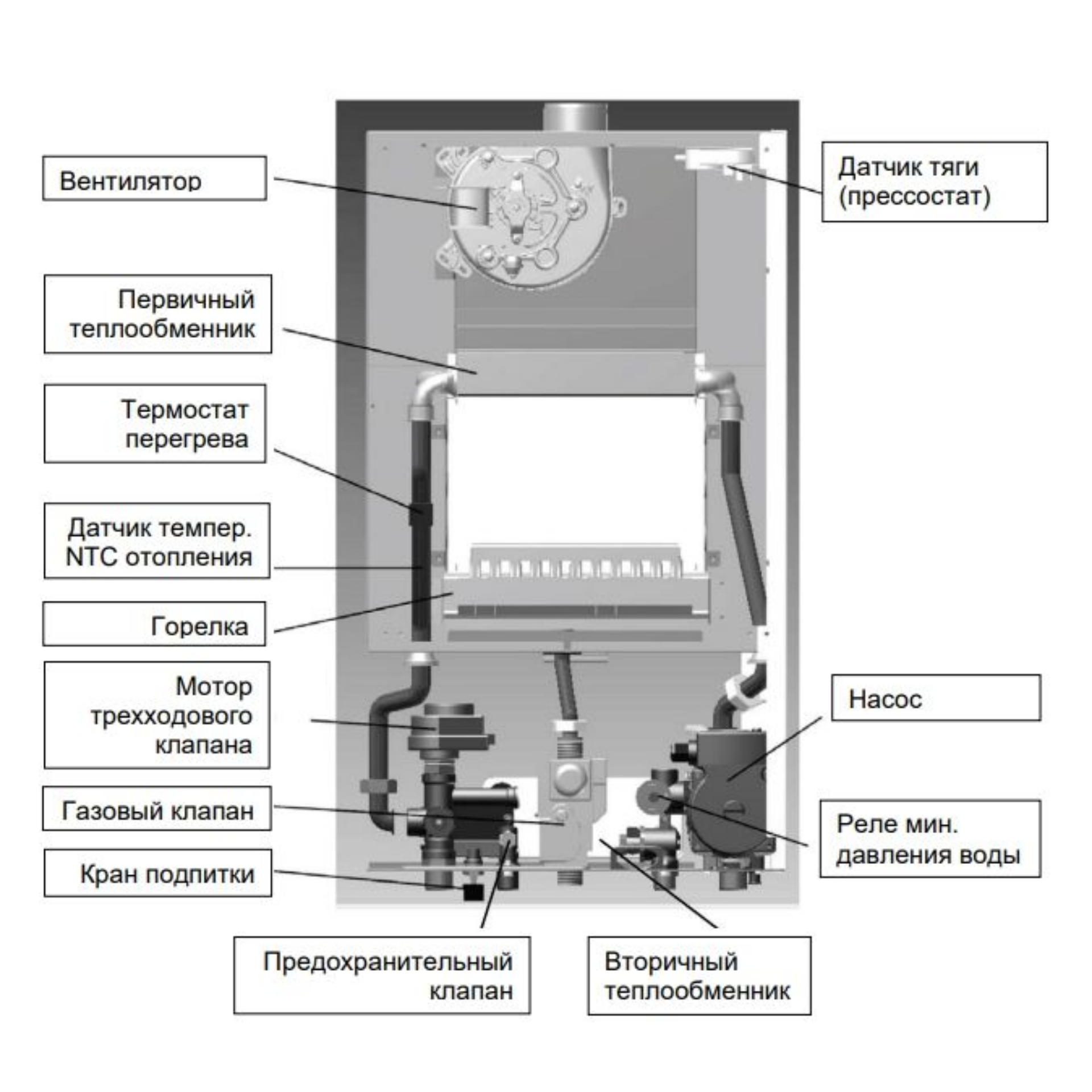 | Особенности | воздухоотводчик, встроенный расширительный бак, встроенный циркуляционный насос, манометр, термометр |