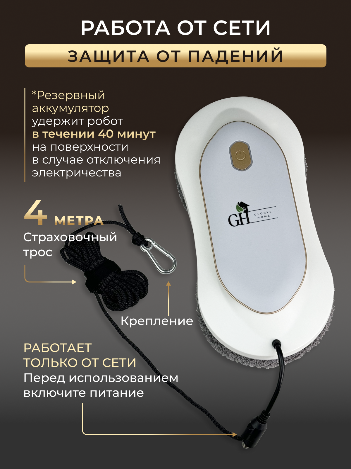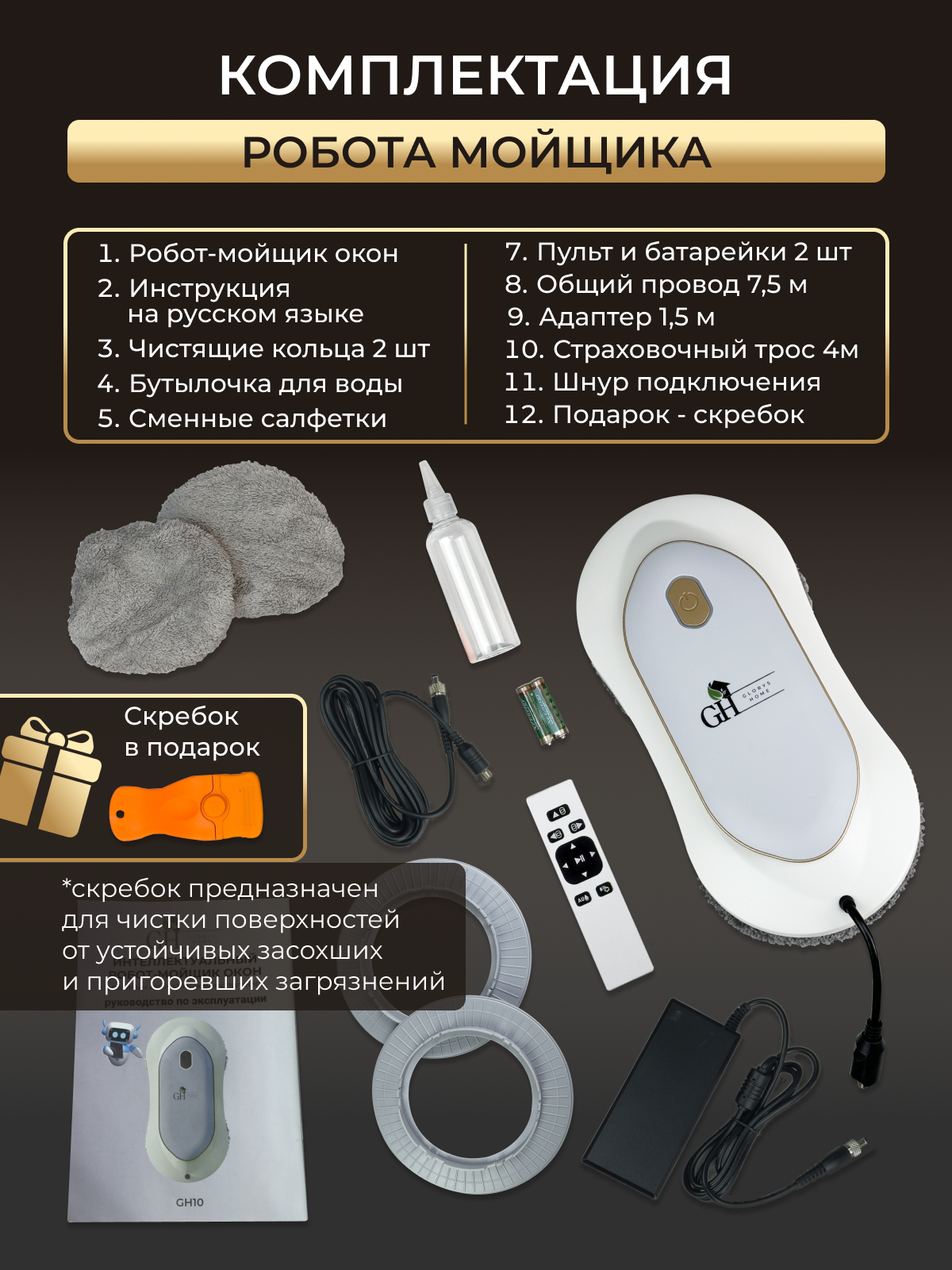 | В комплекте | адаптер питания, аккумулятор, зарядное устройство, моющая тряпка, пульверизатор, пульт ДУ, скребок, страховочный шнур, удлинитель сетевого шнура, фиксирующее кольцо |
