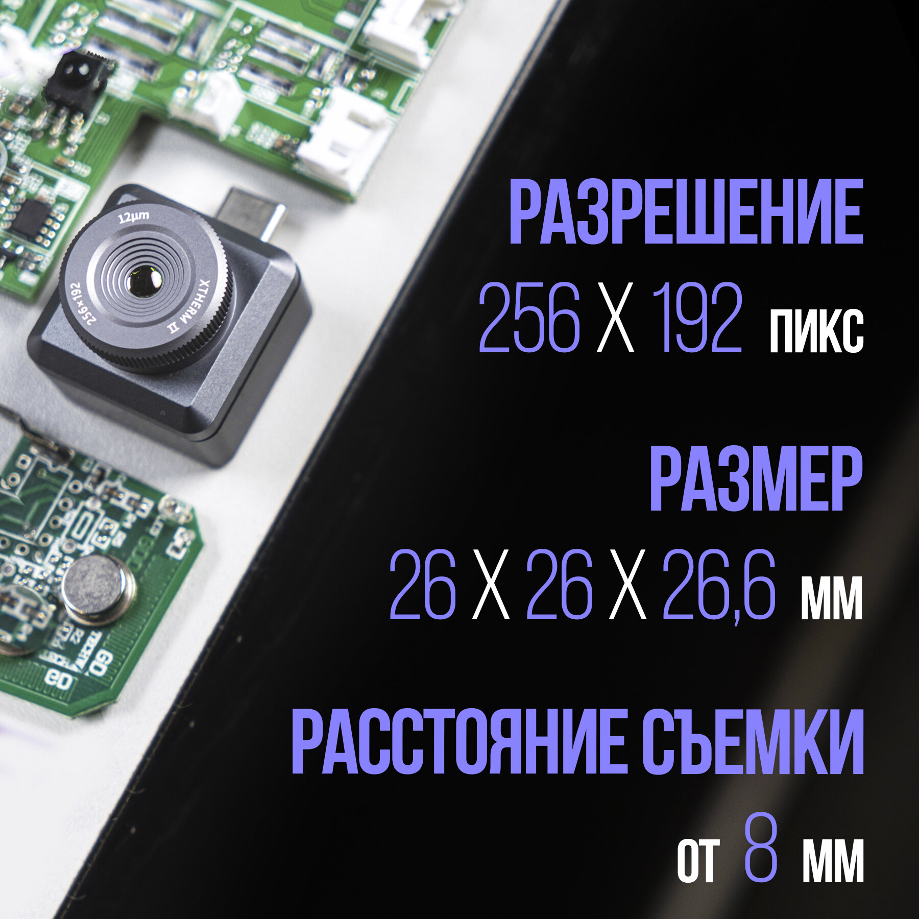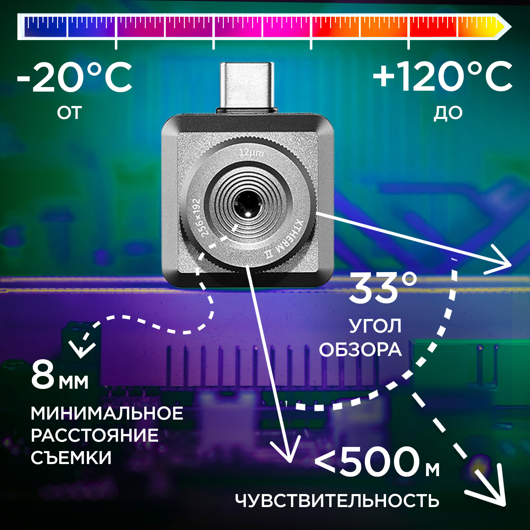 | Плюсы: | Хорошо упакован. В комплекте есть два провода: USB Type C (мама)- USB Type C (папа) и USB Type C (мама)- Micro USB (папа) длинной примерно 15 см каждый. Тепловизор имеет резиновую крышку на объективе. Поворотом кольца на объективе регулируется фокусное расстояние до изучаемых объектов и это позволяет рассматривать как элементы вблизи на печатной плате, так и объекты в нескольких метрах . Возможна работа как с Android устройствами с USB OTG, так и с ПК на Windows. Имеет хорошее разрешение, чувствительность и частоту обновления кадров. |