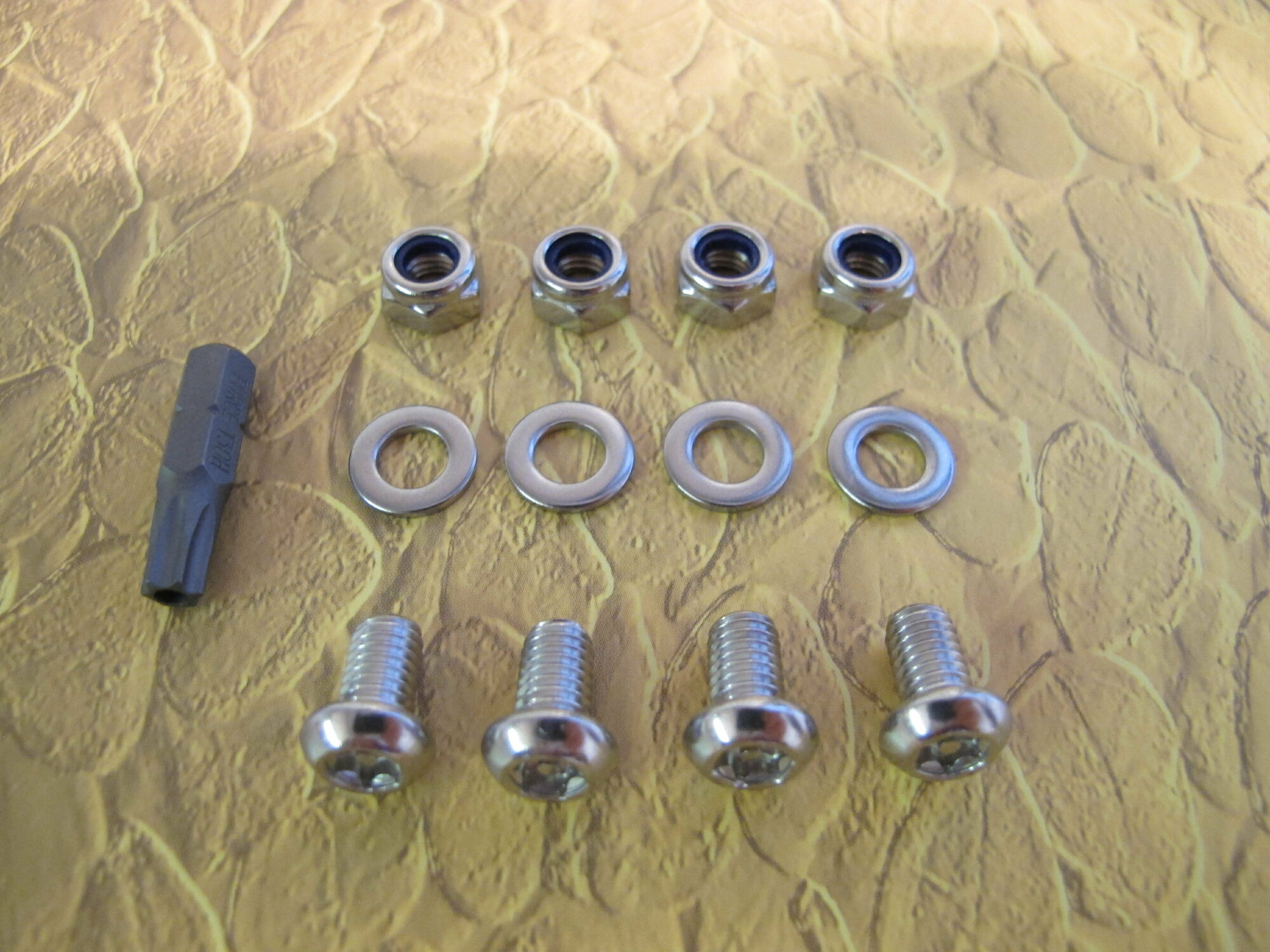 | Комплектация | -Винт М6*10, нержавеющая сталь (Германия) – 4 шт. -Шайба M6, нержавеющая сталь (Германия) – 4 шт. -Гайка М6 с фторопластовой вставкой, нержавеющая сталь (Германия) – 4 шт. -Бита для установки и снятия винтов – 1 шт. -Бонус: самоклеящаяся проставка для защиты кузова от касания с гайкой и защиты от вибрации – 4 шт. |