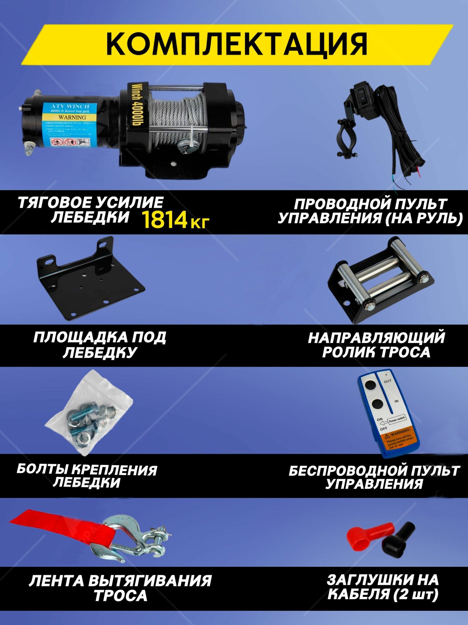 | Подробная комплектация | 1. лебедка со стальным тросом 2. крюк 3. пульт управления проводной 4. пульт управления беспроводной 5. блок управления лебедкой 6. лента вытягивания троса 7. инструкция 8. стопор накручиваемый |