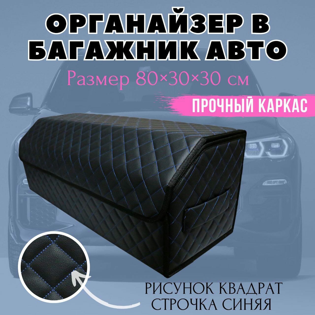 Аксессуары для авто/Органайзер в багажник 80х30х30 рисунок квадрат синий/строчка синяя/окантовка черная/саквояж/бокс/кофр для авто
