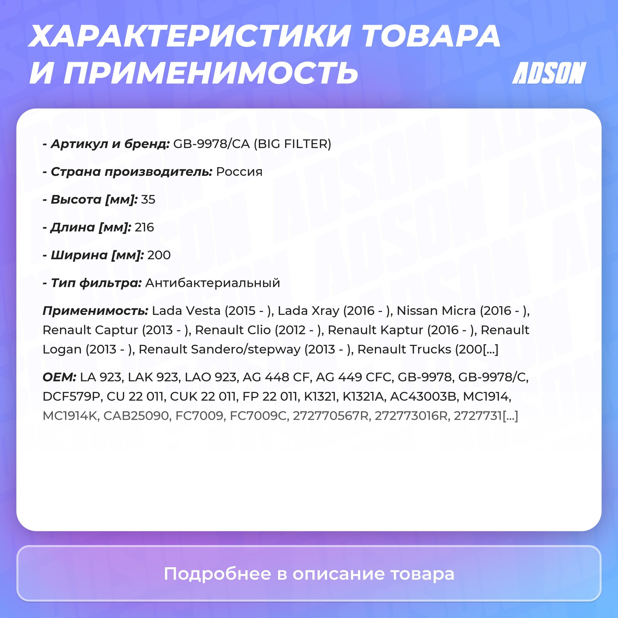 Фильтр салонный (антибактериальный) renault logan iisandero ii 12- lada vesta, BIG FILTER GB9978CA (1 шт.)