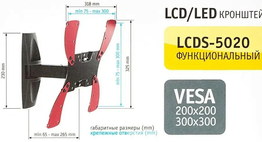 Кронштейн Holder LCDS-5020 черный для ЖК ТВ 10-40" настенный от стены 265мм наклон +15° поворот 100° до 30кг