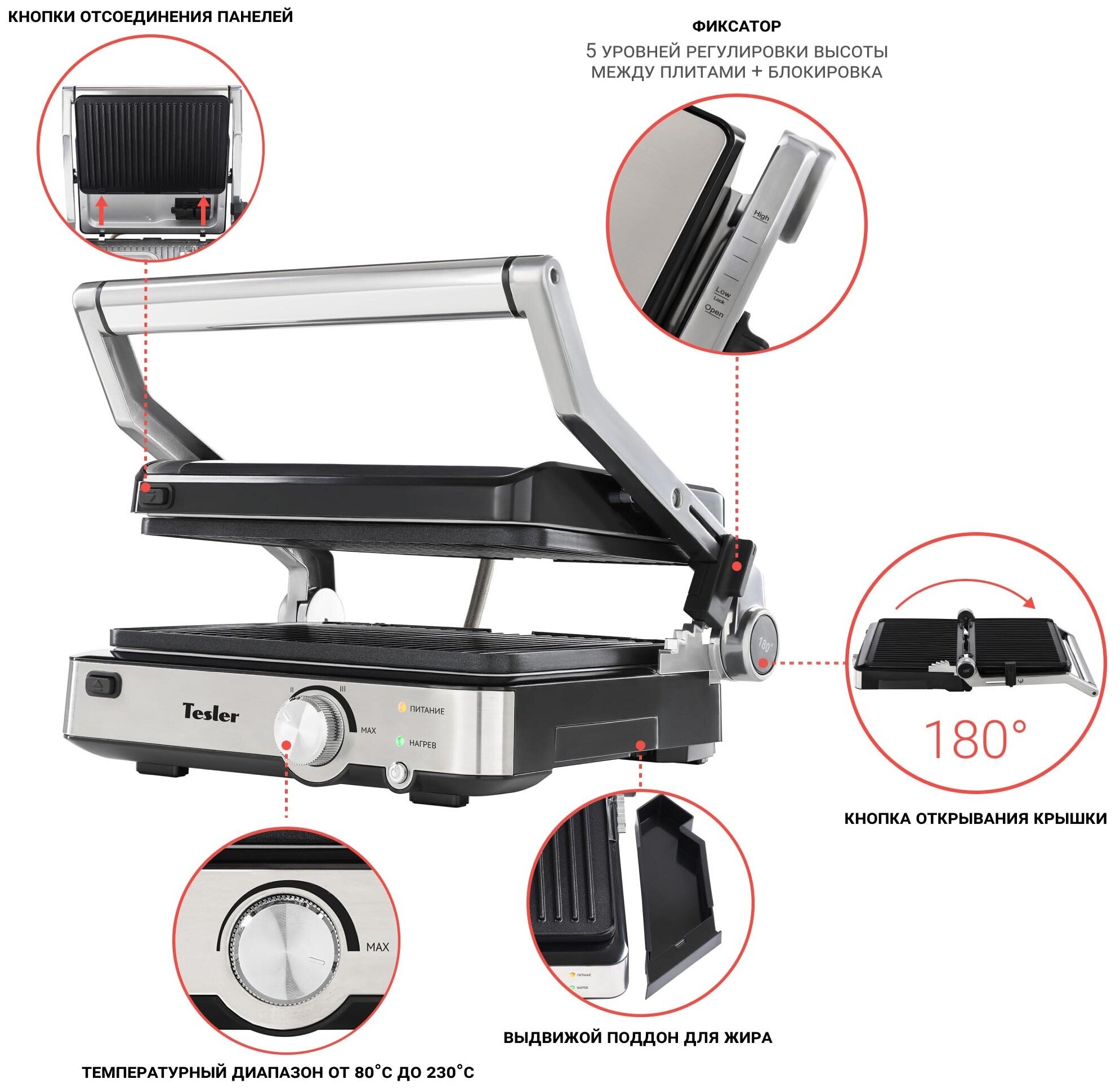 | Дополнительные функции | угол раскрытия 180 градусов / встроенный в гриль-панели нагревательный элемент / регулятор мощности |