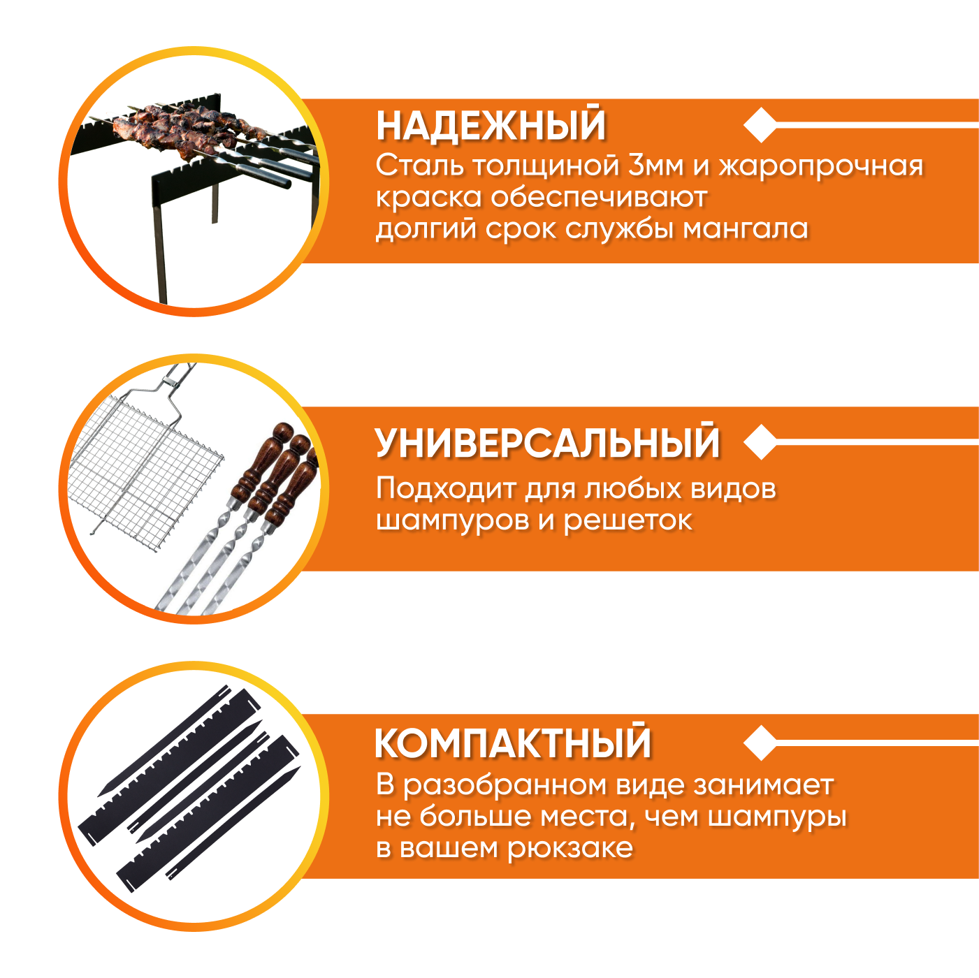 | Дополнительная информация | Общее число пазов для шампуров - 17шт.Рекомендованное количество шампуров - 6шт; Жаропрочная черная краска; Сталь 3мм |