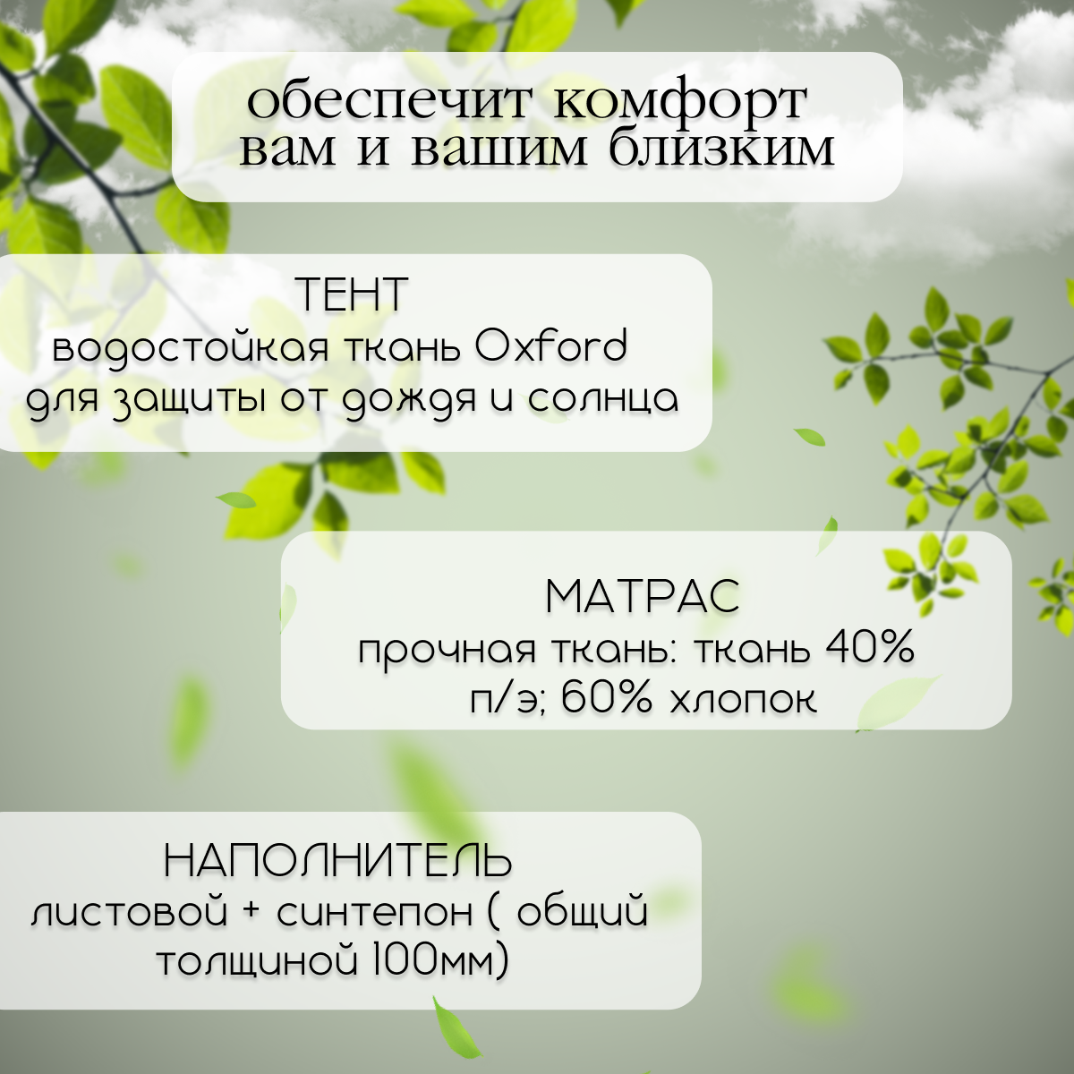 | Плюсы: | Если вы любитель спать на свежем воздухе, лучше не найти! Размер спального места поражает, толщина матраса то же, светильник. Все предусмотрено для комфортного сна. Наматрасник на липучках, при необходимости можно постирать. Цена намного дешевле, чем у других продавцов. Да, можно придраться, не хватило две гайки при сборки. Но это ничто по сравнению, с теми положительными эмоциями, которые дарит эта качель! |
