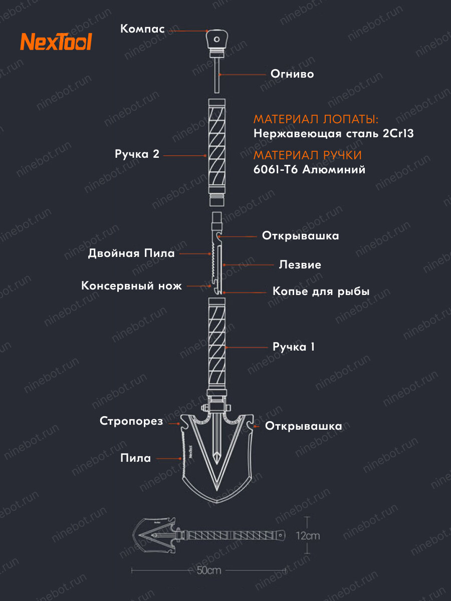 | Дополнительная информация | Лопата имеет 9 функций: 1. Компас. 2. Стеклобой. 3. Кресало. 4. Канатный нож. 5. Открывашка. 6. Огниво. 7. Пила. 8. 2 составные ручки. 9. Лопата. |