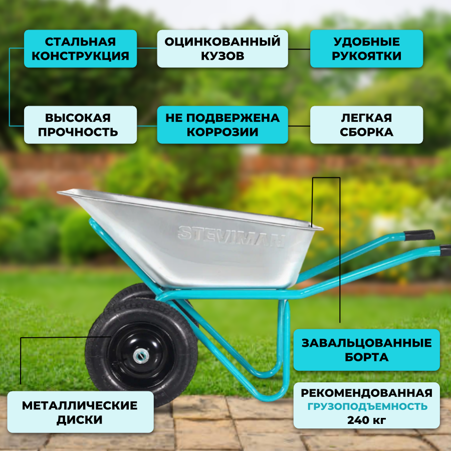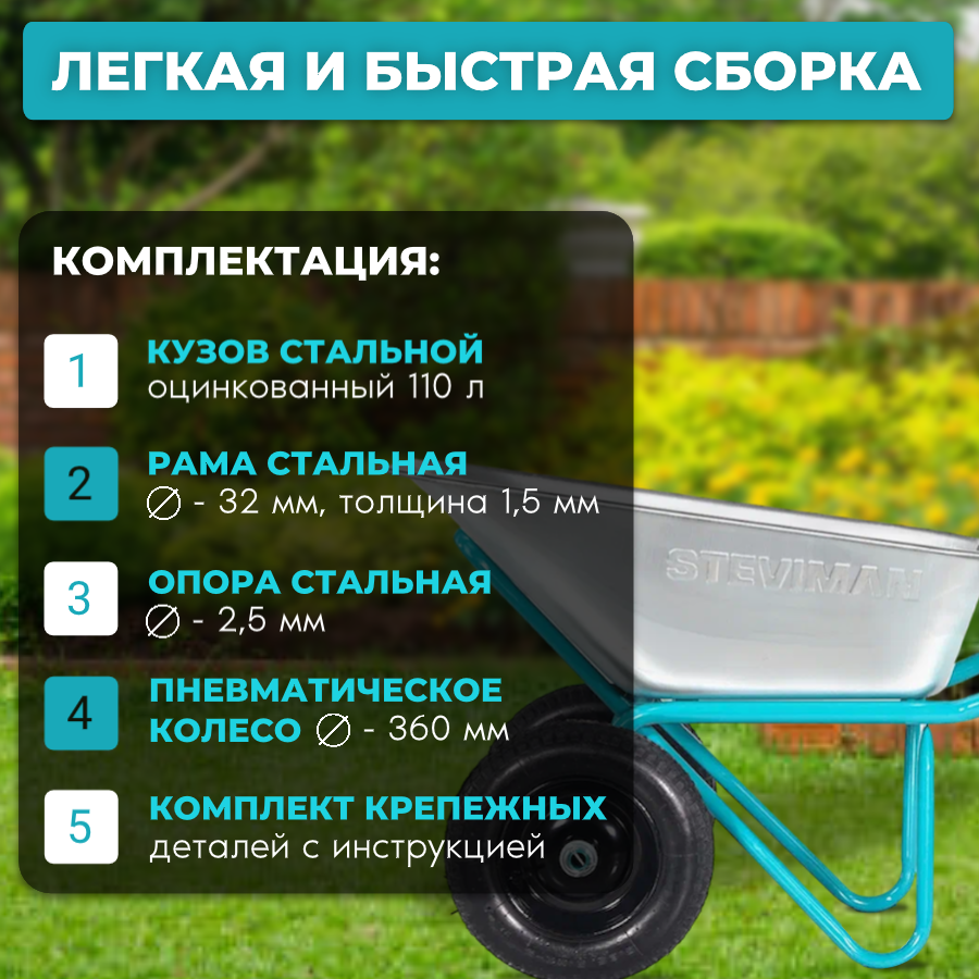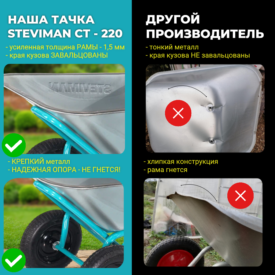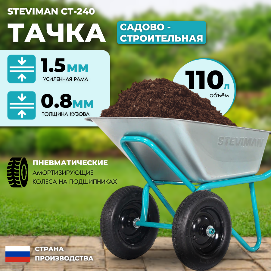 Тачка садовая/строительная Steviman CT-240 двухколесная, 110л., 240 кг, усиленная рама 1,5 мм. интересное: