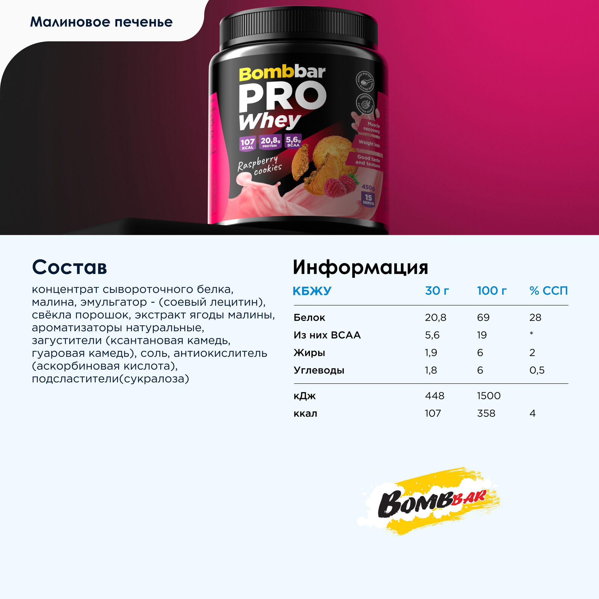 СохранитьBombbar Pro Whey Protein Протеиновый коктейль без сахара "Малиновое печенье", 450 г интересное:
