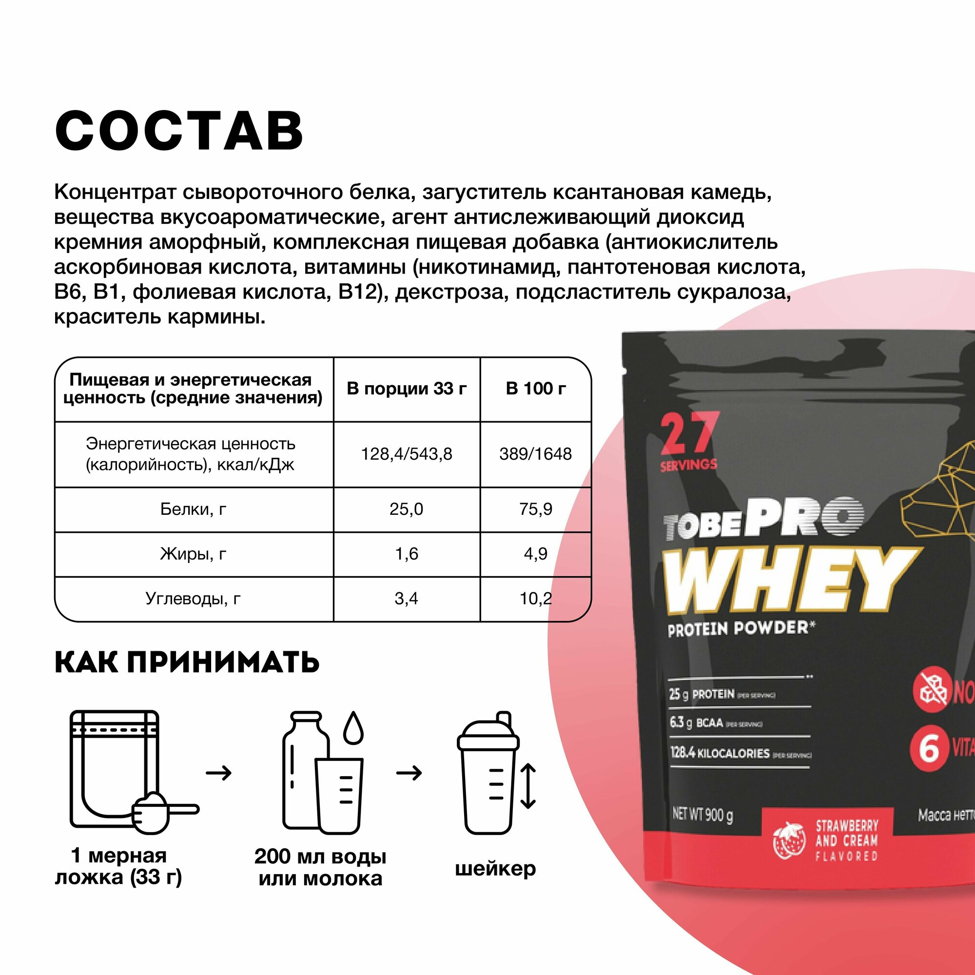 Протеин сывороточный без сахара TobePRO Whey Protein с ВСАА Клубника со сливками, 900 г/30 порций