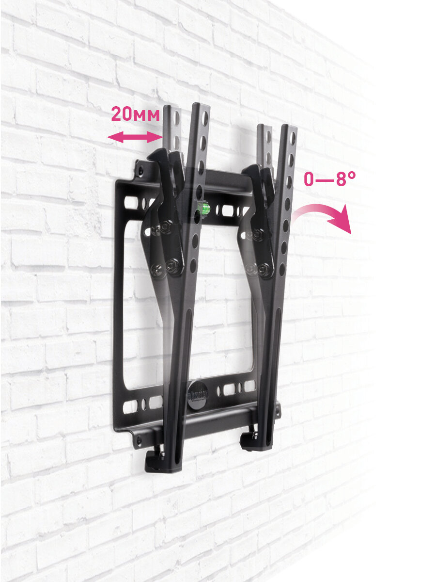 | Плюсы: | Цена и небольшие размеры. Подходит для диагоналей до 43 дюймов. Больше уже не подойдет. Возможность регулировки угла наклона. |