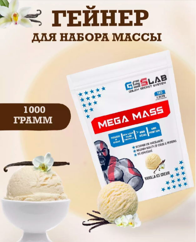 Mega Mass GSS Lab - гейнер для мышечной массы с ванильным вкусом 1 кг интересное: