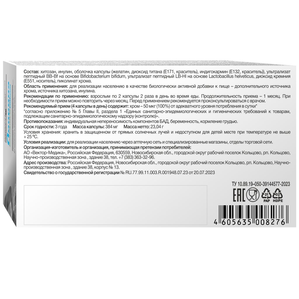 | Дополнительная информация | Уникальный комплекс на основе хитозана, инулина, ультрализатов, пиколината хрома способствует комфортному снижению веса без диет и повышенных физических нагрузок. |