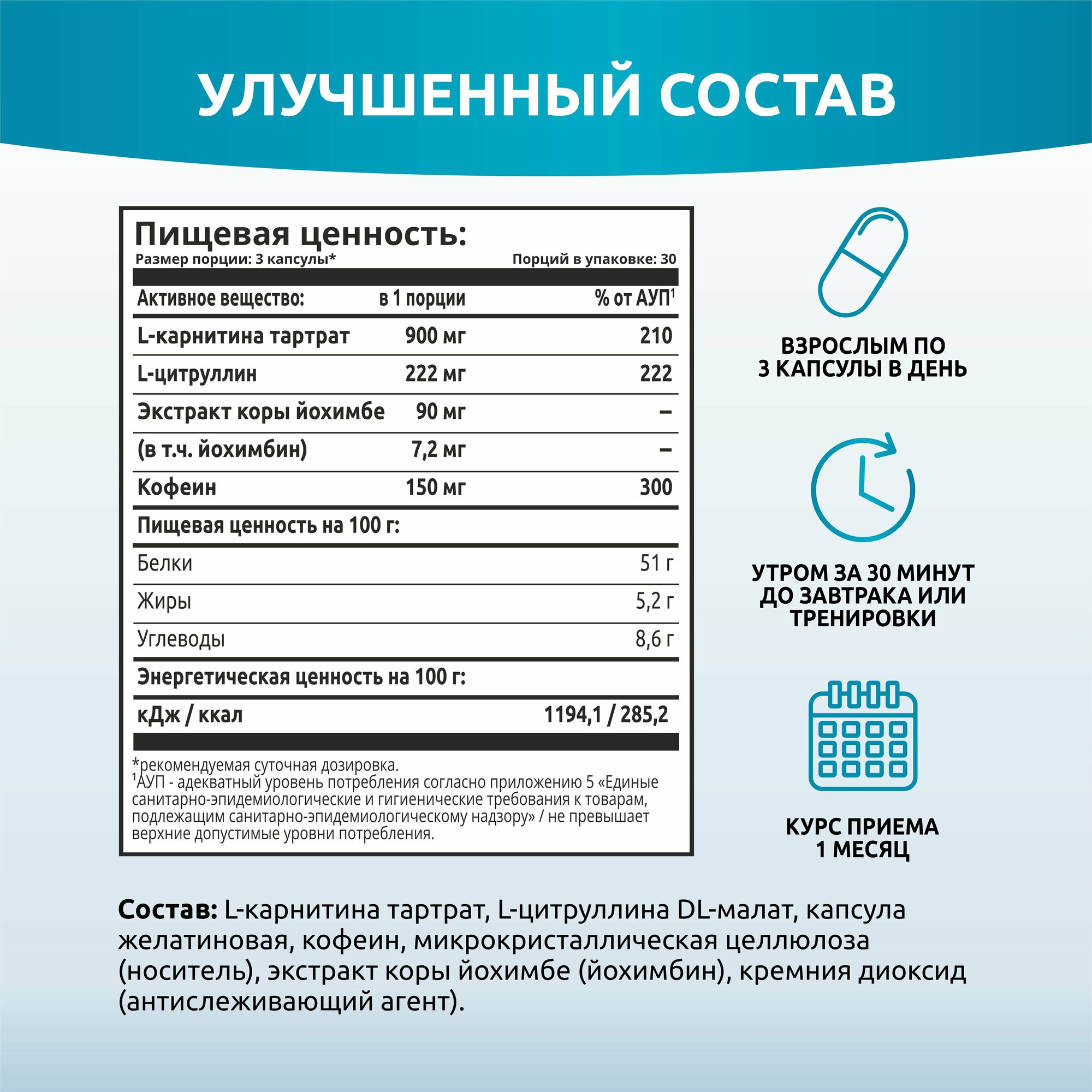 | Дополнительная информация | L-карнитина тартрат, L-цитруллина DL-малат, капсула желатиновая, кофеин, микрокристаллическая целлюлоза (носитель), экстракт коры йохимбе (йохимбин), кремния диоксид (антислеживающий агент). |