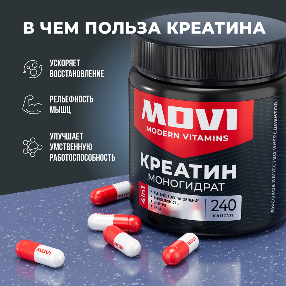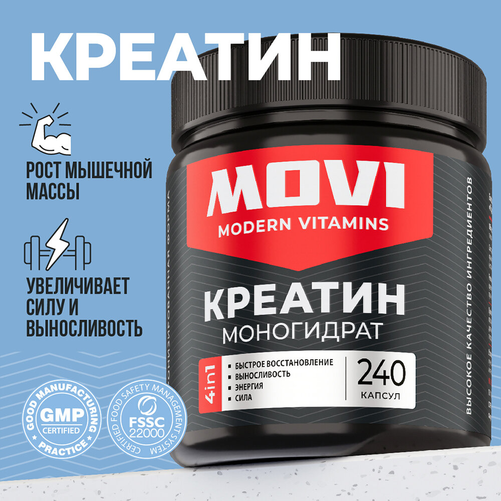 Креатин моногидрат MOVI в капсулах Creatine Monohydrate, 240 капсул, спортивное питание для набора массы тела интересное: