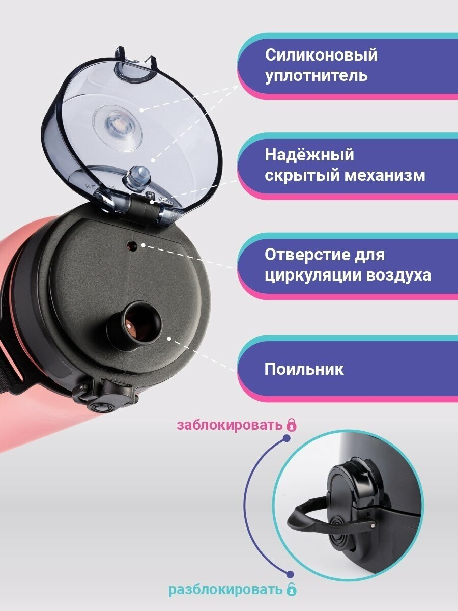 | Дополнительная информация | Не впитывает запахи. Подходит для горячих и холодных напитков, лимонадов. Безопасный, легкий и сверхпрочный материал. Герметичная крышка на замке. Ситечко. Поильник. Мерная шкала |