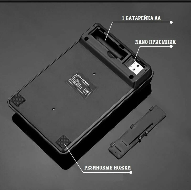 | Комплектация | Беспроводной NumPad, адаптер USB. Обратите внимание! Батарейка ААА в комплект не входит! |