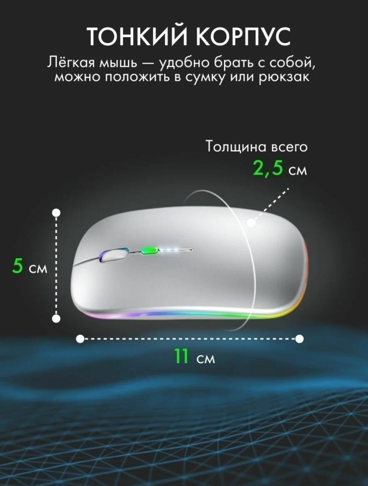СохранитьМышь беспроводная компьютерная аккумуляторная / 3 режима DPI (800/1200/1600) Bluetooth + USB 2.4Ghz / RGB подсветка / Серебро интересное:
