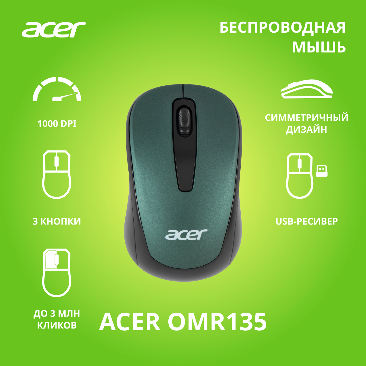 Купить Мышь Acer OMR135 зеленый оптическая (1000dpi) беспроводная USB для ноутбука (2but)