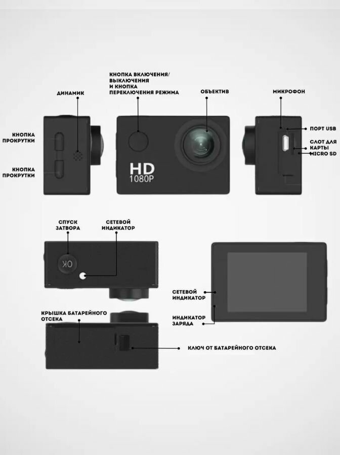| Комплектация | камера для съёмки видео , водонепроницаемый бокс для камеры, три вида креплений и 2 виде держателей, USB кабель, инструкция |