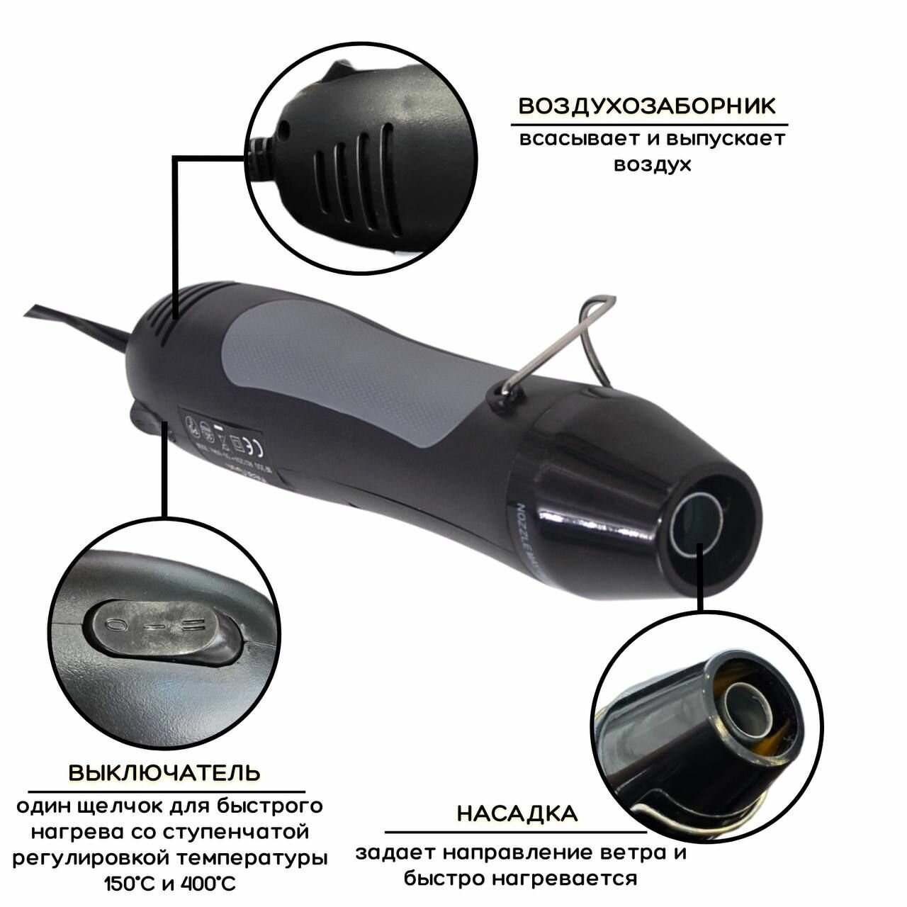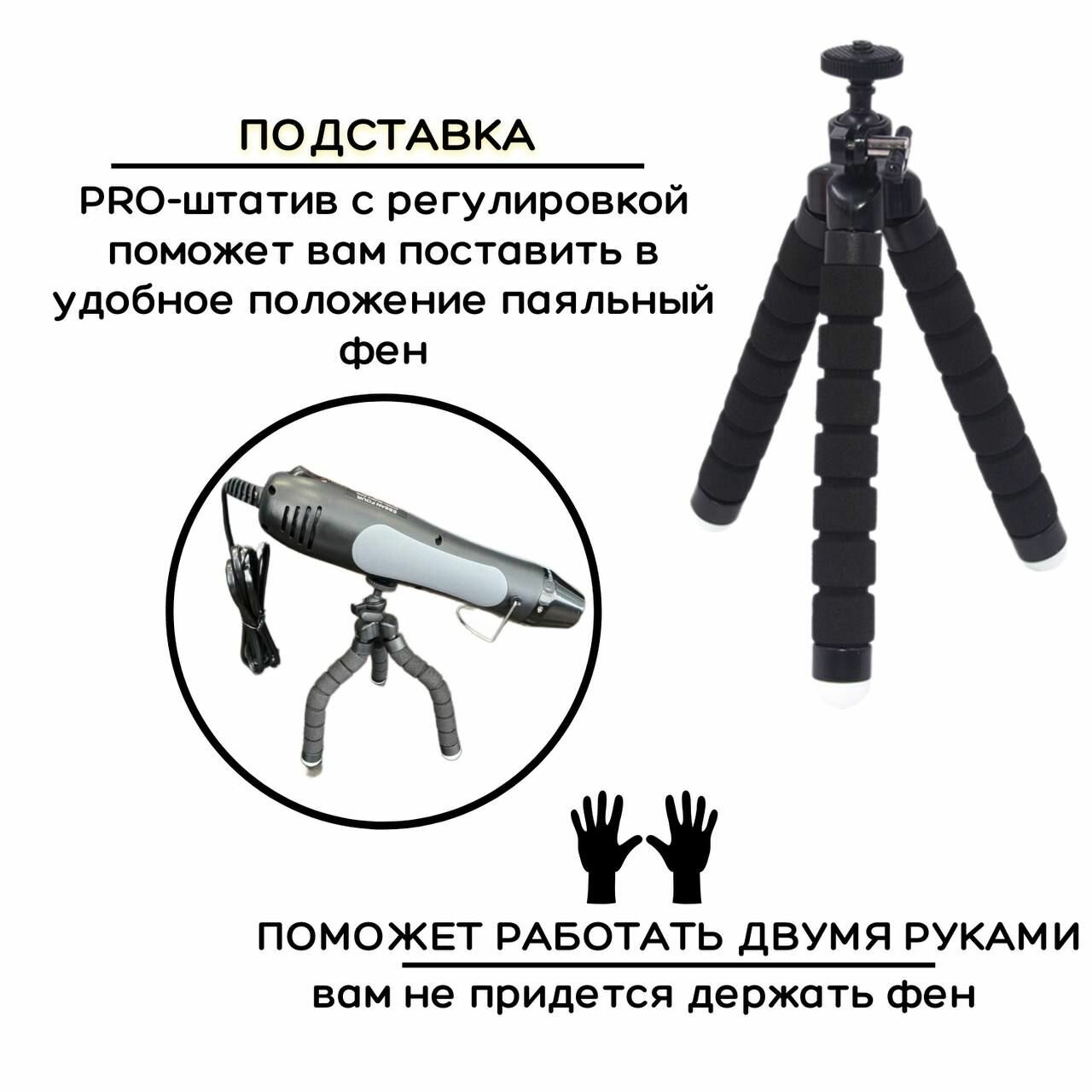 Мини паяльный фен для термоусадки KEBBI FOUR 230V, 400С, 350W, черный, регулировка 2 насадки,подставка,штатив интересное: