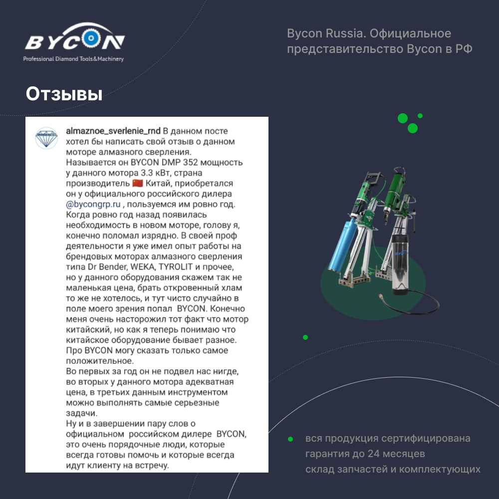 Ниже Вы можете прочитать отзывы на Дрель алмазная BYCON DMP-162P 2.2 кВт Байкон для алмазного бурения, максимальный диаметр 162 мм, сухое/мокрое сверление, ознакомится с подробными характеристиками, посмотреть интересные обзоры и фотографии на Дрель алмазная BYCON DMP-162P 2.2 кВт Байкон для алмазного бурения, максимальный диаметр 162 мм, сухое/мокрое сверление.