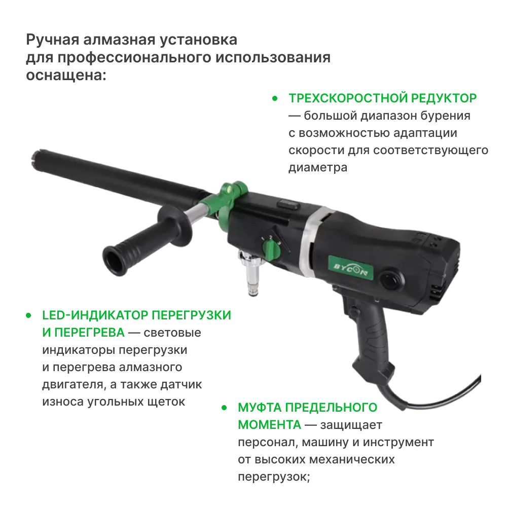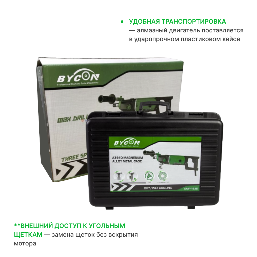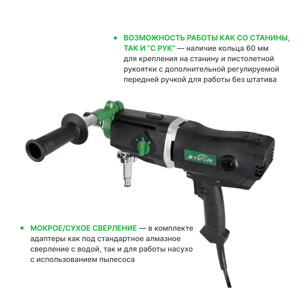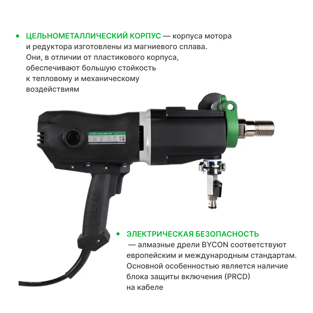 Дрель алмазная BYCON DMP-132P 1.8 кВт Байкон для алмазного бурения, максимальный диаметр 132 мм, сухое/мокрое сверление интересное: