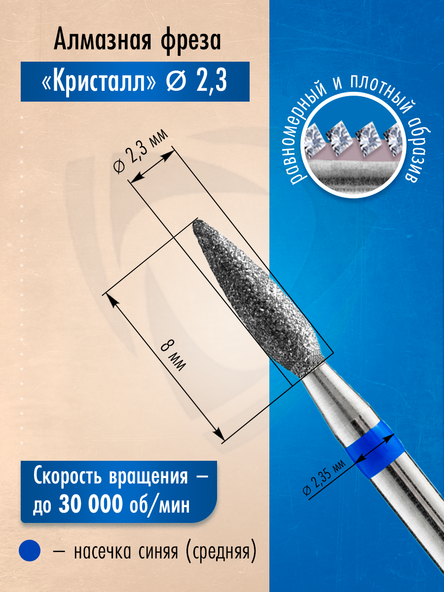 Кристалл, Алмазная фреза (пламя острое, каплевидное), D2,3, L080, средняя, 866.104.242.080.023, 5 шт